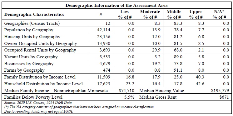 D&B data for 2024, the most recent year available, provided a standard of comparison for small business and small farm loans. D&B is an entity that maintains a database of information on businesses and farms using a variety of resources including public records, trade references, and surveys. D&B data is used as a general indicator of the local economy and includes information from only those entities that voluntarily report. U.S. Census data from 2020 and FFIEC information from 2025 were used as a standard of comparison for home mortgage lending.