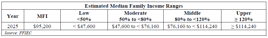 The Federal Financial Institutions Examination Council (FFIEC)-estimated median family income level is used to analyze home mortgage loans under the Borrower Profile criterion. The following table illustrates the FFIEC-estimated median family income ranges for nonmetropolitan Minnesota in 2025.