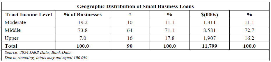 The geographic distribution of small farm loans reflects reasonable dispersion throughout the assessment area. While none of the 72 small farm loans made in the assessment area were in the sole moderate-income census tract, the bank’s lending performance is comparable to D&B data, which shows that only 0.8 percent of assessment area farms are in this tract.