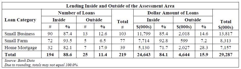 Farmers State Bank of Underwood made a substantial majority of its small business, small farm, and home mortgage loans, by both number and dollar volume, within its assessment area. As previously noted, small business and small farm lending received the most weight in the analysis. See the following table for details.
