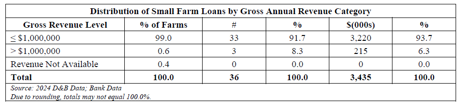 The distribution of borrowers reflects excellent penetration among farms of different sizes. As illustrated in the following table, the bank’s performance is comparable to D&B data but is elevated to excellent when considering 2022 Census of Agriculture data. Per the 2022 Census of Agriculture, 61.3 percent of producers in Douglas, Grant, Otter Tail, and Wilkin counties list their primary occupation as “Other” rather than farming. The 2022 Census of Agriculture also revealed that 65.4 percent of farm operations in these counties did not report interest expenses related to their operations. Bank management confirmed this statement and noted that many farms in the assessment area have off-farm income and do not need credit to finance farm operations. Considering this information, the performance is excellent.
