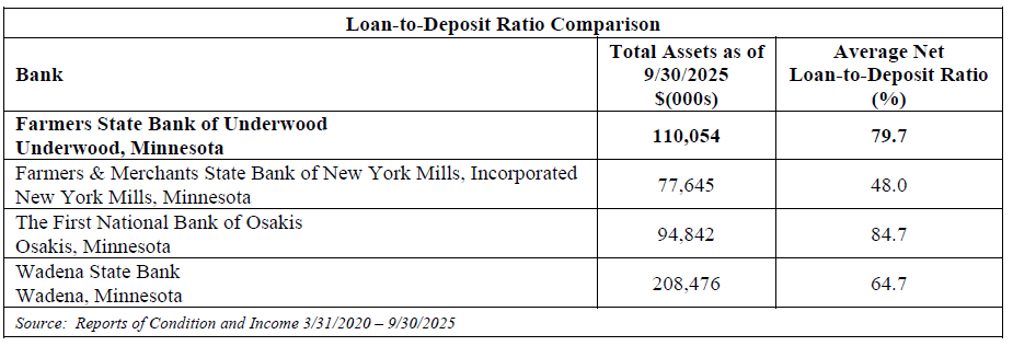 Farmers State Bank of Underwood is not required to collect or report its small business, small farm, or home mortgage loan data and has elected not to do so. As such, the tables presented in the Lending Test do not include direct comparisons to aggregate lending data. However, the aggregate lending data provides an indication of the level of demand and competition for small business, small farm, and home mortgage loans. There is a significant level of demand and competition for small business loans in the assessment area, as evidenced by 2024 CRA aggregate CRA data, which is the most recent year available, shows that 55 lenders reported 1,823 small business loans originated or purchased within the assessment area. Similarly, 2024 aggregate CRA data shows that 23 lenders reported 538 small farm loans originated or purchased within the assessment area. These figures do not include the number of loans originated by smaller institutions that are not required to report lending data but operate within the assessment area. The overall volume of small business and small farm lending reflects a competitive market. Furthermore, there is an increased level of competition for home mortgage loans in the assessment area amongst banks, credit unions, and non-depository mortgage lenders, as evidenced by 2024 HMDA aggregate data, which is the most recent year available. In 2024, 138 lenders reported 983 home mortgage loans originated or purchased within the assessment area.