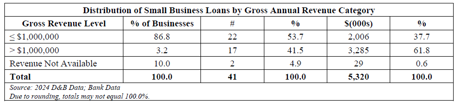 The distribution of borrowers reflects reasonable penetration to businesses of different revenue sizes. As shown in the table below, the bank’s lending performance to businesses with gross annual revenues of $1 million or less lags the comparable demographic data.