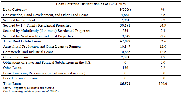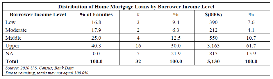 Finally, 21.9 percent of the home mortgage loans originated in 2025 are commercial purpose/non-owner occupied, such as rental properties, which result in a borrower income level of not available (NA). This skews the lending performance to all income levels. When considering these factors, the bank’s performance is reasonable.