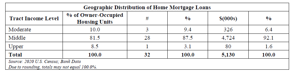 The geographic distribution of home mortgage loans reflects reasonable dispersion throughout the assessment area. As shown in the table below, the bank’s performance in the moderate-income tract is comparable to 2020 U.S. Census data.